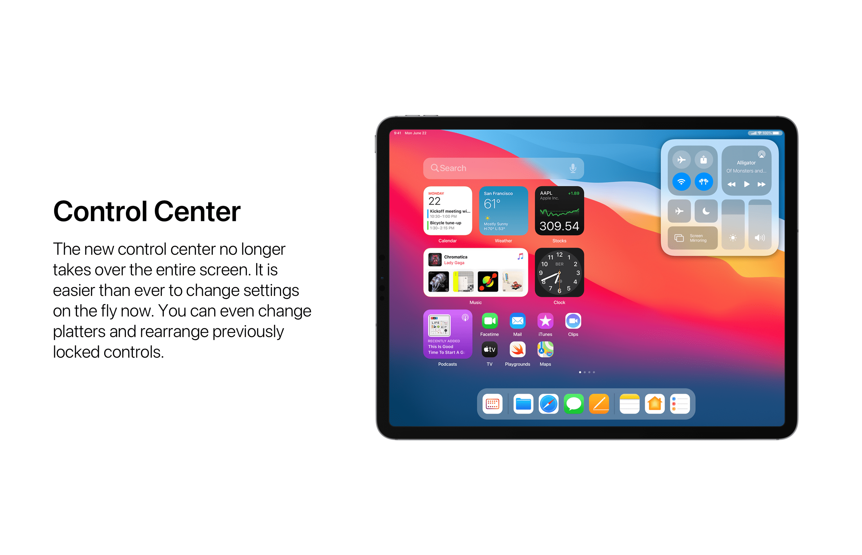 Ovládacie centrum. Známa súčasť systému je po novom kompaktnejšia a zaberá menej priestoru na displeji iPadu. Parker takisto prezentuje možnosť prispôsobenia, kedy by ste si mohli preskupiť jednotlivé ovládacie prvky tak, ako to vyhovuje vám. Koncept ukazuje aj to, ako by vyzeralo nové UI v orientácii na výšku, či na malom displeji iPadu mini.