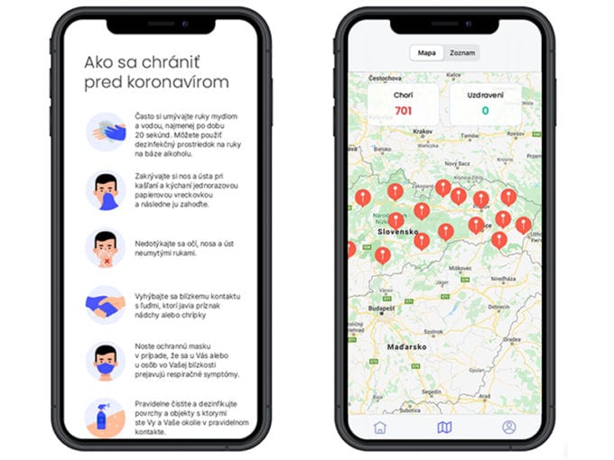V apke môžete sledovať aj aktuálnu situáciu ohľadom COVID-19 na našom území. Na mapke uvidíte mestá, resp. mestské časti s infom o počte pozitívne testovaných. Okrem mapového zobrazenia je k dispozícii aj zoznam.