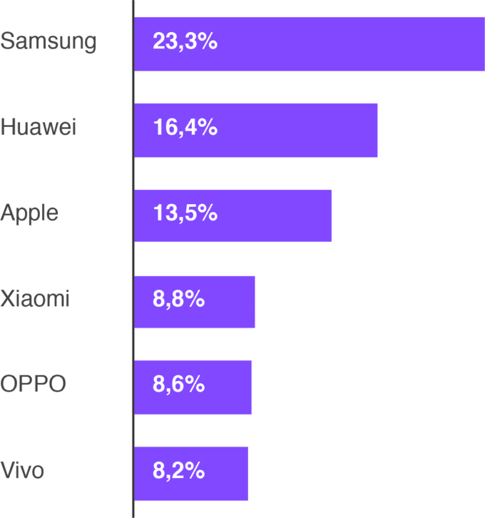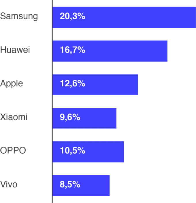 Pokiaľ ide o poradie v predajoch prvého kvartálu, prvé a tretie miesto obsadili SamsungApple, medzi nimi sa umiestnil Huawei. Nasledujú značky Xiaomi, OPPOVivo. Práve posledná spomenutá ako jediná zaznamenala v úvode roka rast. Napriek tomu, že si Samsung či Apple držia popredné pozície, ich trhový podiel má podľa odhadov v budúcom štvrťroku klesnúť, na úkor ostatných značiek.