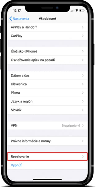 Zoskrolujte na Resetovanie (Reset) a ťuknite.