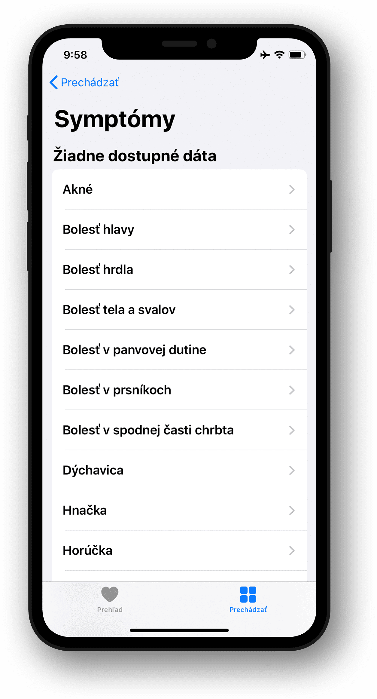Do apky Zdravie pribudli Symptómy. Táto nová funkcia umožňuje pridávať symptómy pre rôzne ochorenia ako sú napríklad bolesti tela a svalov, zmeny v stravovacích návykoch, kašeľ, bolesti hlavy a ďalšie.