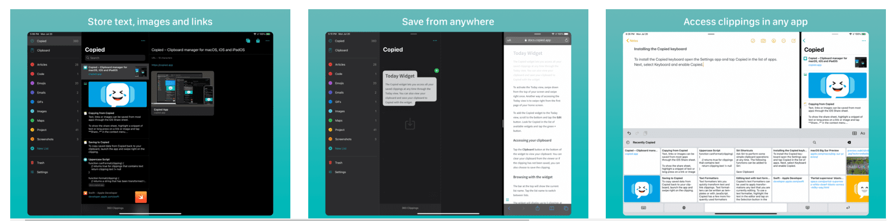 Aplikácia Copied slúži na kopírovanie textu, odkazov a obrázkov, umožňuje vytvárať zoznamy, usporiadať výstrižky. Údaje sa synchronizujú pomocou iCloudu, takže sú dostupné na všetkých zariadeniach od Applu.
