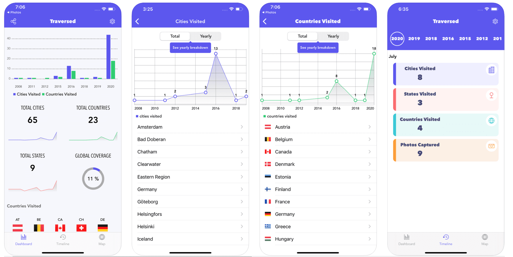 Aplikácia Traversed vám umožňuje vizualizovať všetky navštívené miesta na základe vašej knižnice fotografií. Ľahko uvidíte všetky krajiny, mestá a štáty, ktoré ste navštívili. Aplikácia poskytuje podrobný cestovný informačný panel, ktorý zobrazuje cestovné štatistiky.