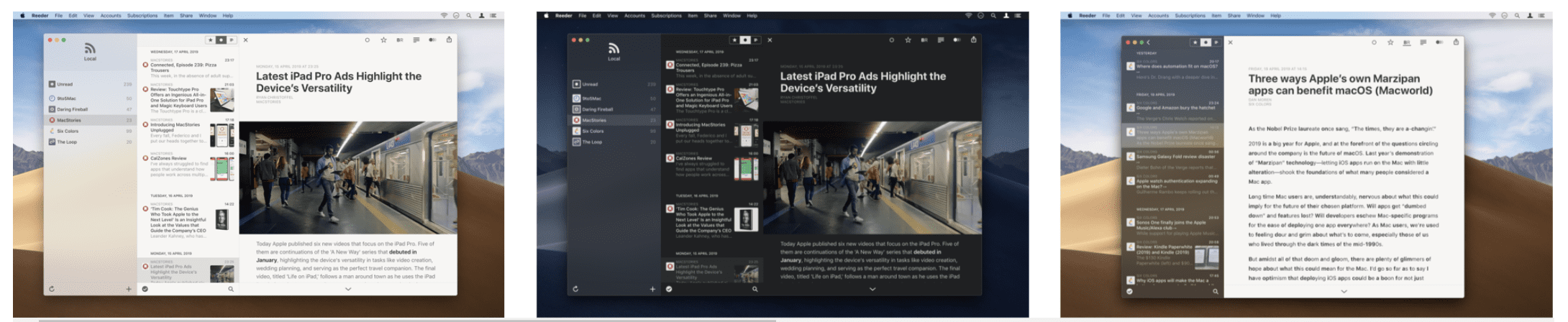 Reeder je čítačka správ pre počítače Mac s podporou rôznych synchronizačných služieb. Aplikácia ponúka: čítanie neskôr v aplikácii, ktorá sa synchronizuje s iCloudom, ukážky obrázkov v zozname článkov, prehliadač obrázkov, navigovanie prostredníctvom gest a klávesových skratiek.