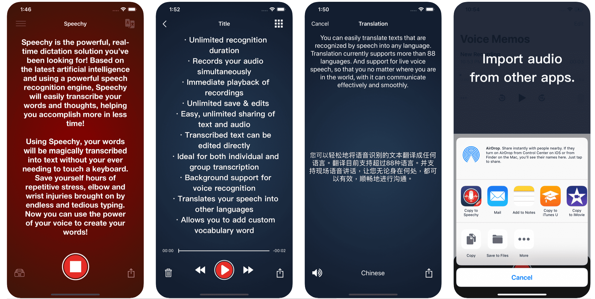 Aplikácia Speechy využíva umelú inteligenciu na rozpoznávanie reči a prevedie vaše slová na text, bez toho, aby ste sa museli dotknúť klávesnice. Speechy nielen prepisuje vaše slová, ale aj zaznamenáva váš hlas, aby ste sa mohli k pôvodnej nahrávke vrátiť neskôr. Navyše môžete neskôr ľahko zdieľať svoje textové a zvukové súbory. Aplikácia podporuje 88 svetových jazykov, medzi ktorými nájdete aj slovenský a český.