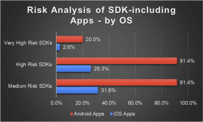 Kým v prípade operačného systému Apple odosielalo vysoko rizikovým prijímateľom 26% aplikácií, Android apky dosiahli výsledok 91%. Adresátom v kategórii najvyššieho rizika odosielalo informácie 2,6% iOS a 20% Android aplikácií.