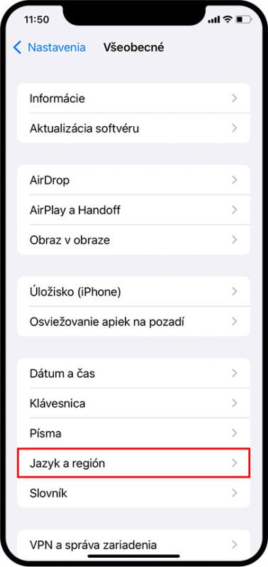 4. Vráťte sa opäť do Nastavenia / Všeobecné a vyberte sekciu Jazyk a región (Language & Region).