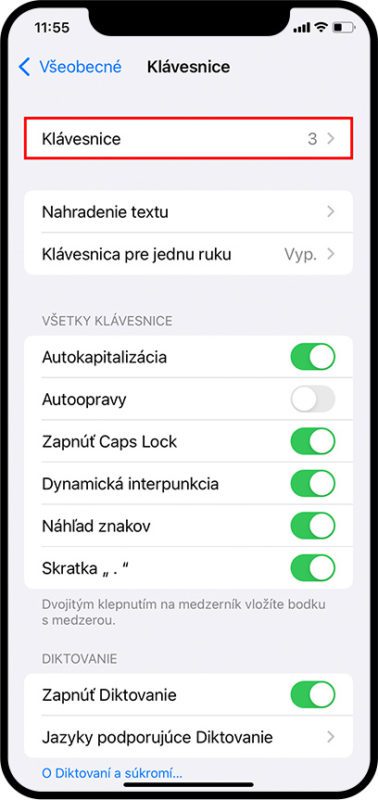 2. Zvoľte sekciu Klávesnica (Keyboard) a v nej hneď hore Klávesnice (Keyboards). Tu by ste mali mať v na druhom mieste položku Anglická (Spojené štáty) (English – USA).