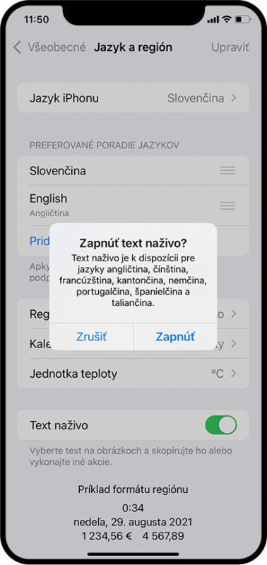5. Tu by ste mali ako druhý jazyk Angličtinu (Engish) a úplne dolu je možné prepnutím aktivovať funkciu Live Text, alebo po slovensky Text naživo.