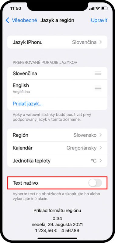 5. Tu by ste mali ako druhý jazyk Angličtinu (Engish) a úplne dolu je možné prepnutím aktivovať funkciu Live Text, alebo po slovensky Text naživo.