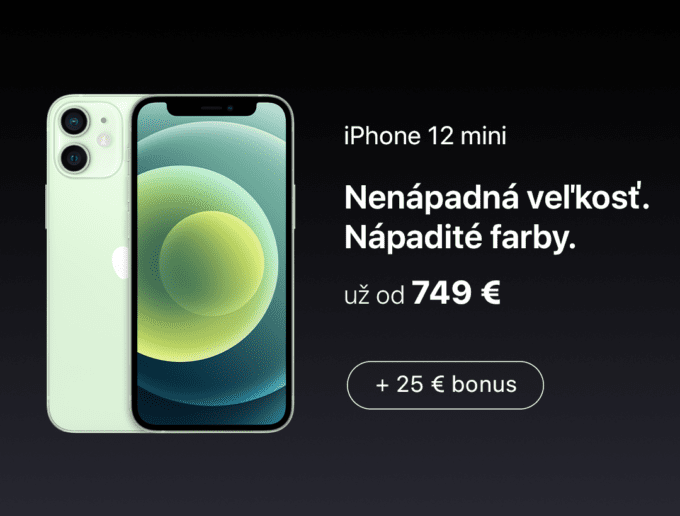 iPhone 12 mini kúpite už od 749 € alebo si môžete vybrať nákup na splátky od 19 € mesačne. iPhone 12 je k dispozícii od 849 € alebo takisto na splátky – od 22 € mesačne. Doprava kuriérom je pri nákupe nad 50 € zadarmo.