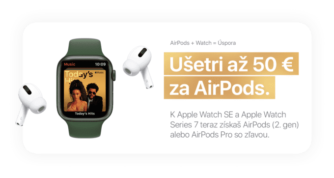 Napríklad AirPods k Apple Watch teraz môžete mať až s 50 € zľavou. K Apple Watch SE a Apple Watch Series 7 získate AirPods 2. generácie alebo AirPods Pro so zľavou. V prípade modelu AirPods Pro ide o 50 € zľavu a pri AirPods 2 je to 20 €.