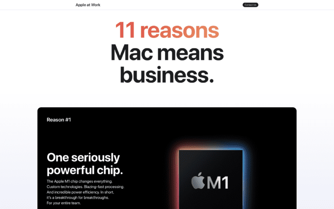 Apple nový M1 propaguje aj v rámci novej podstránky na svojom webe. Na nej značka sumarizuje 11 dôvodov, prečo je Mac ideálnou voľbou pre biznis klientov. Čip podľa Apple ponúka v porovnaní s najpredávanejším PC notebookom až 2-násobne väčší výkon v Exceli, o polovicu rýchlejšiu odozvu webových aplikácií a 2-krát dlhšiu výdrž batérie počas videohovorov cez Zoom.