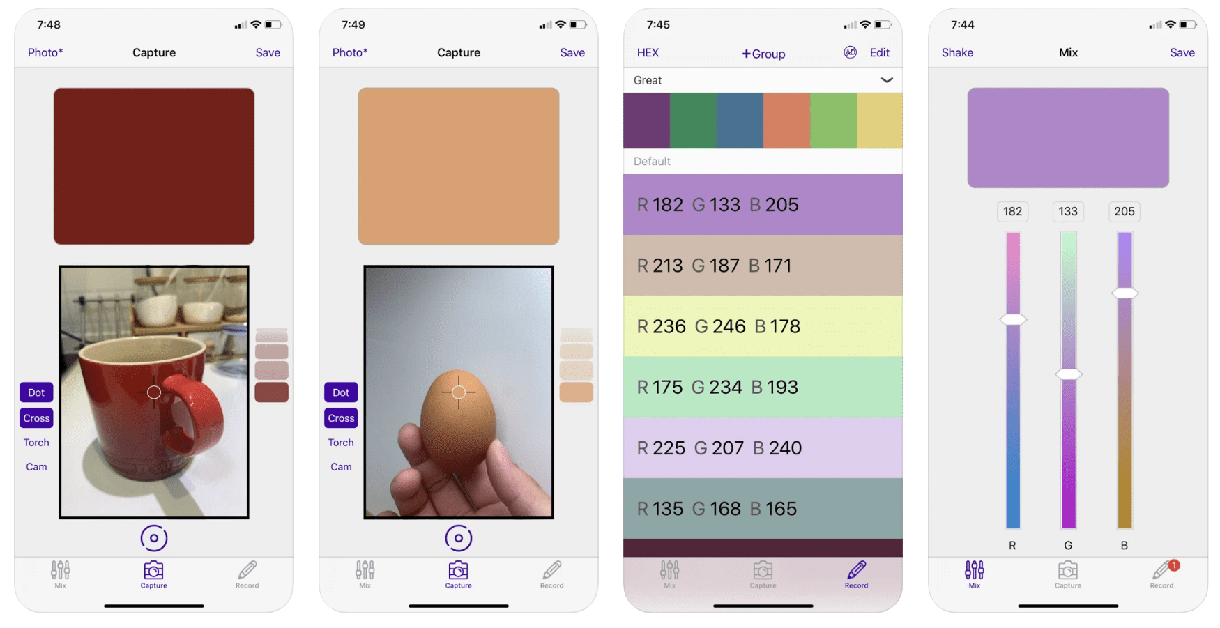Pomocou nástroja Lanse – Capture&Save Color môžete pomocou fotoaparátu identifikovať a zachytiť farby vo modeloch: RGB, HEX, CMYK, HSB.