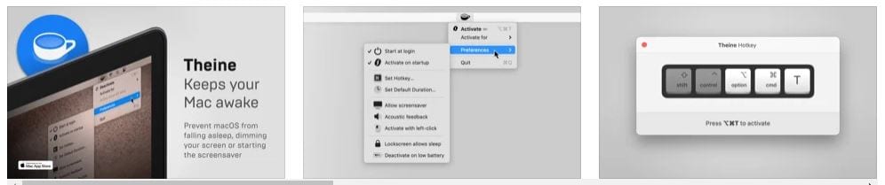 Aplikácia Thein‪e‬ zabráni tomu, aby sa Mac uspal, stlmil obrazovku alebo spustil šetrič obrazovky.
