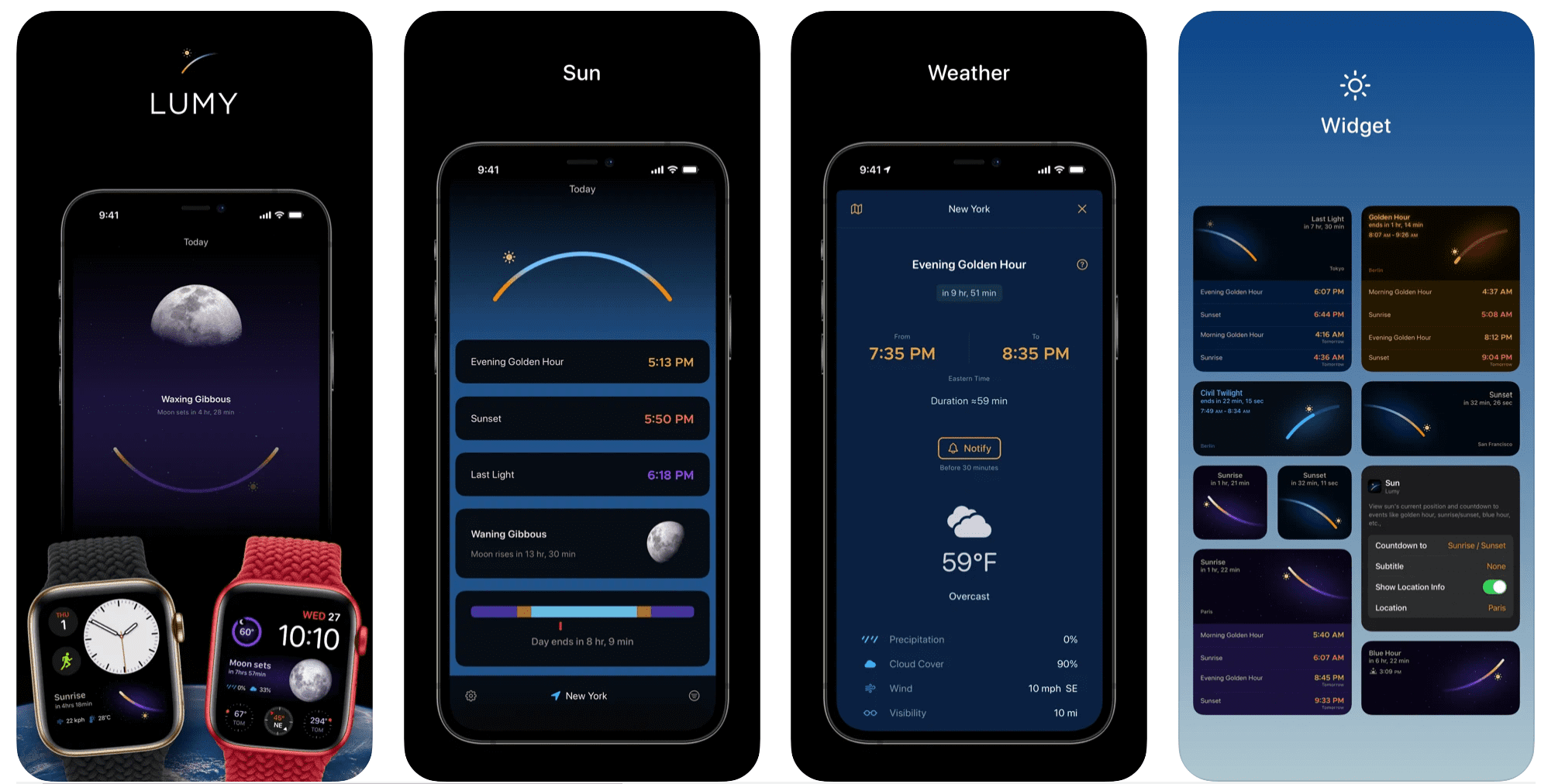 Lumy je jednoduchá a krásna aplikácia pre fotografov a všetkých, ktorí chcú sledovať slnko alebo mesiac. S Lumy môžete predvídať najlepšie svetelné podmienky a vopred sa pripraviť na ich využitie. Aplikácia vám tiež zobrazí informácie o počasí na nasledujúcich sedem dní, aby ste si mohli veci naplánovať.