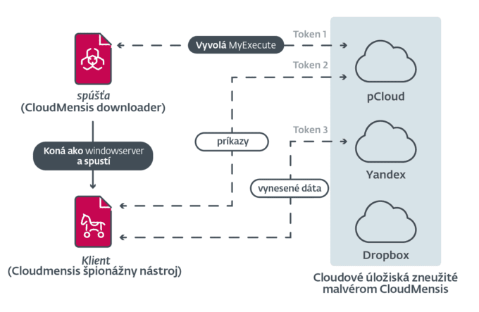 CloudMensis zneužíva cloudové úložiská na prijímanie príkazov od útočníkov aj na vynášanie dokumentov. V rámci schémy využíva tri rôzne služby: pCloud, Yandex Disk a Dropbox. Konfigurácia zahrnutá v analyzovanej vzorke obsahuje autentifikačné tokeny pre pCloud a Yandex Disk.