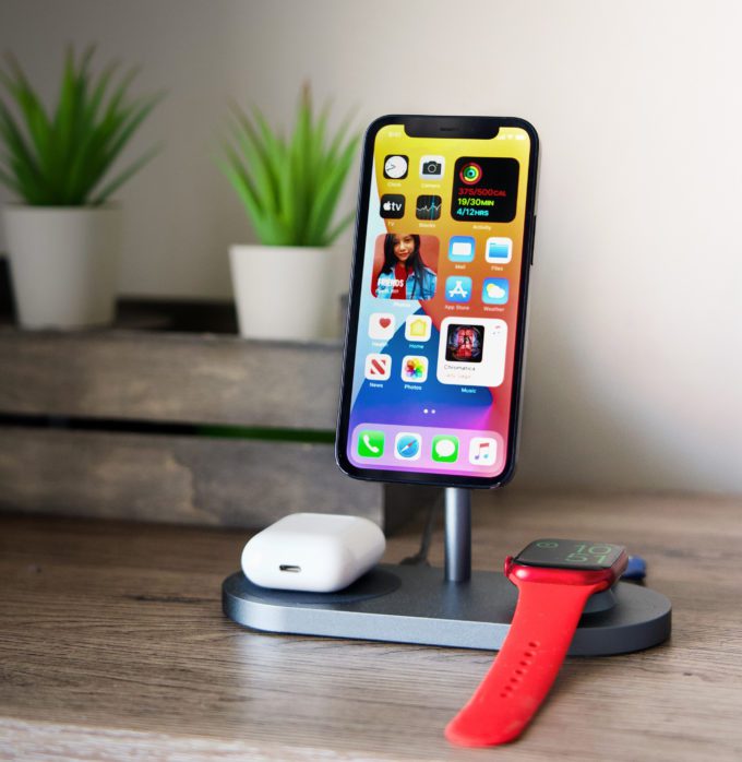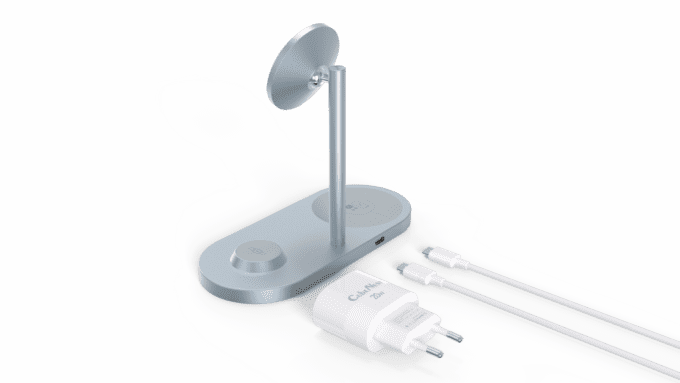 Jedná sa o 3v1 bezdrôtovú nabíjačku so štandardom Qi, ktorá disponuje dvoma vertikálnymi bezdrôtovými nabíjačkami (štandardná a pre Apple Watch) a jednou horizontálnou bezdrôtovou nabíjačkou, ktorú je možné polohovať.