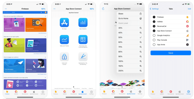 DashTabs poskytuje jednoduchý prístup k vývojárskym nástrojom ako sú Firebase, AdMob, RevenueCat a App Store Connect atď. Môžete sledovať svoje analýzy, sledovať predaje svojej aplikácie,spravovať zostavy aplikácií a metadáta.