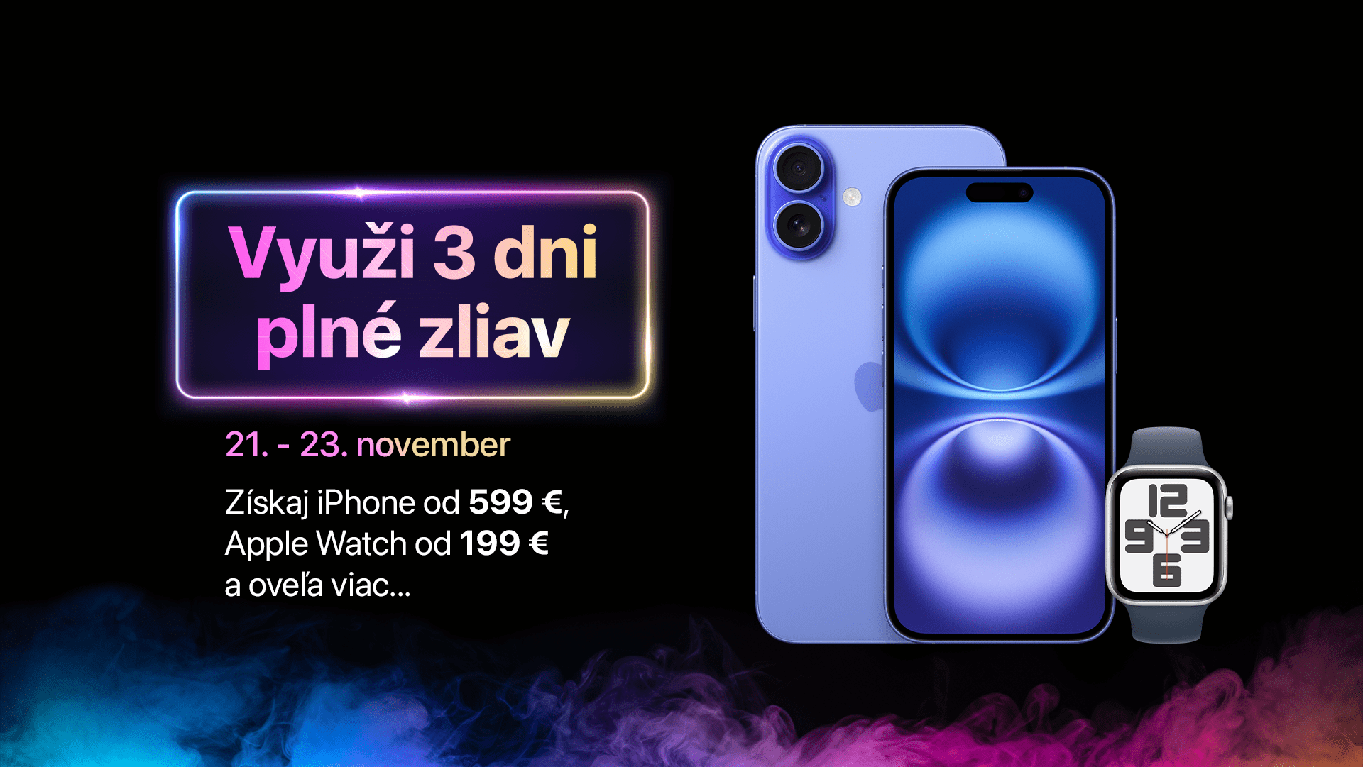 Počas troch dní budú v ponuke zľavnené iPhone, iPad, Apple Watch, MacBook, AirTagy aj množstvo príslušenstva. Zľavy platia len do vypredania zásob. Akcia sa začína 21. 11. o 8:00.