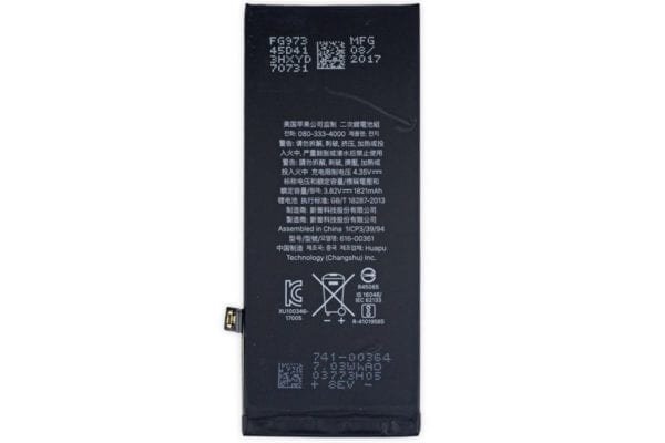 Největším komponentem (hned po displeji a hliníkovo-skleněném tělu) je baterie. Ta má u iPhonu 8 kapacitu 1821 mAh, což je lehce méně než u iPhonu 7. Kapacita baterie u iPhonu 7 je totiž 1960 mAh. Přestože je baterie u letošního modelu o něco menší, zařízení by stále mělo vydržet nabité stejně, jako model loňský. To je možné díky vylepšením procesoru.