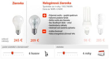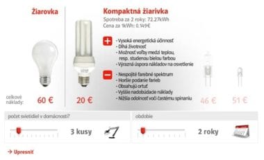 pokračovanie článku Viete, že kompaktná žiarivka alebo LED diódy vám môžu ušetriť až 80 % spotreby energie?26. marca 2010pridaj komentár Inzercia | Portál Setri.sk prináša kalkulačku, ktorá vám pomôže zistiť, koľko môžete ušetriť používaním žiariviek, halogénových alebo LED…
