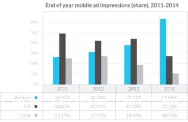 pokračovanie článku iOS zabezpečuje najväčšie príjmy z reklamy, Android najviac zobrazení4. februára 2015pridaj komentár Mobilný operačný systém iOS si aj v roku 2014 udržal prvenstvo v príjmoch z reklamy s podielom 51,67 % (vo štvrtom kvartáli). Náskok…