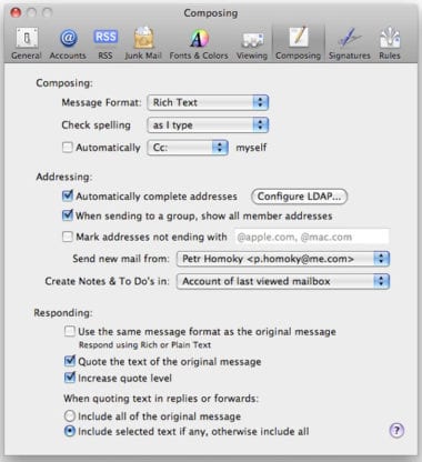pokračovanie článku Tip: nastavenie štandardného (predvoleného) účtu na odesielanie e-mailov v Mail.app18. novembra 20081 komentár Velké množství uživatelů používá více emailových schránek v oblíbené aplikaci Mail od Apple. Větší množství účtů přináší i jednu povinnost…